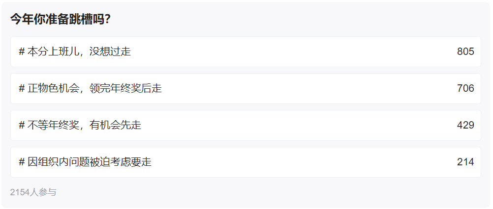 职场社区平台脉脉上的一个投票帖,有关人工智能行业的员工是否考虑跳槽,累计2154人参与,本分上班儿的选项投票虽然最多,但是希望走的人明显更多,抱着“跳槽=升职加薪”想法的人也不在少数,这也算是行业景气的一个象征了。