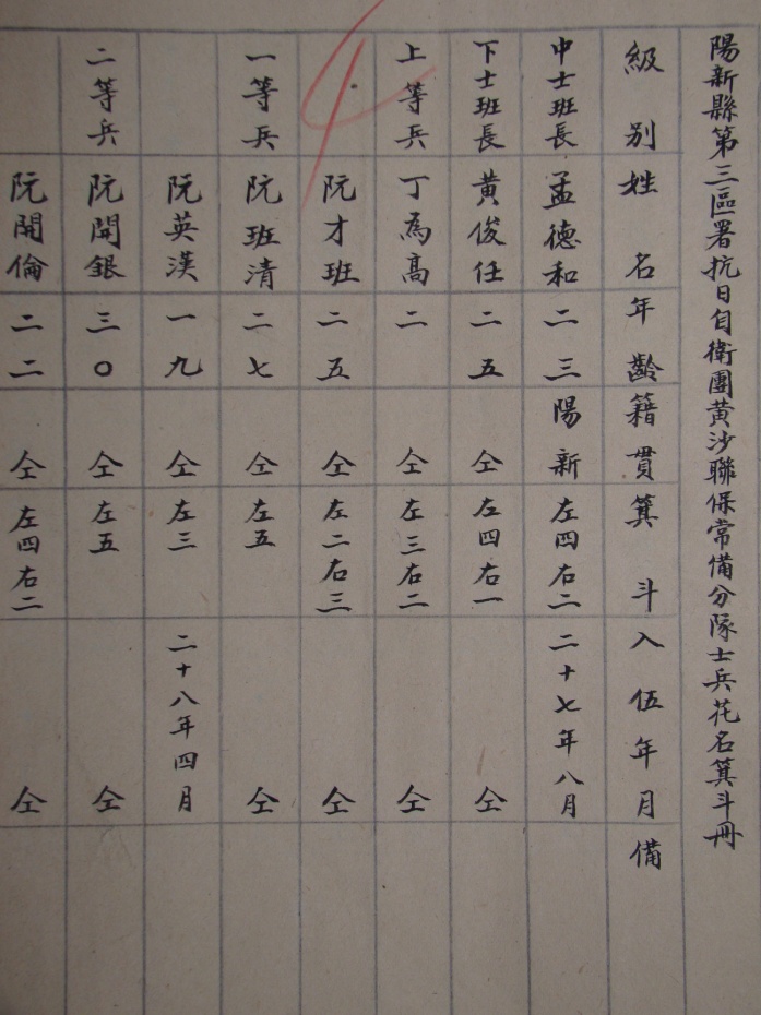 抗战时期太平、慈口、黄沙、梅田、九折、大畈等地报送的,分为联保队、运输队、担架队等。队员级别、年龄、籍贯、入伍年月等信息分列其中,队员都是18至38岁的青壮年